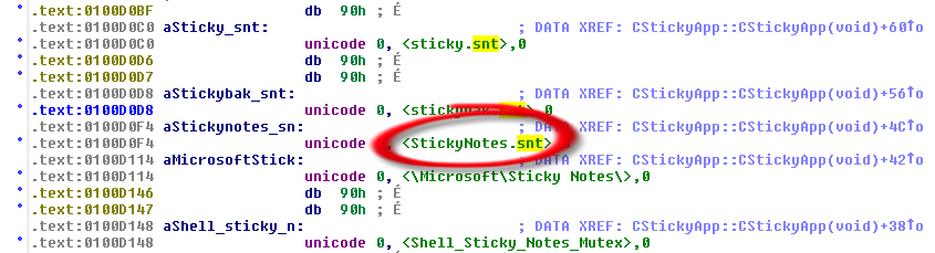 Any quest in the computer world begins by IDA’ing the file (what I call disassembling a file in IDA Pro). This brings up of course a consortium of lines of random (not so random) assembly code/language to divulge through. If you know what you’re looking for (as I did), it may not take too horribly long to get through the lines, especially with the ‘Find’ feature. After a bit of searching, I ended up finding the Holy Grail of Sticky Notes: