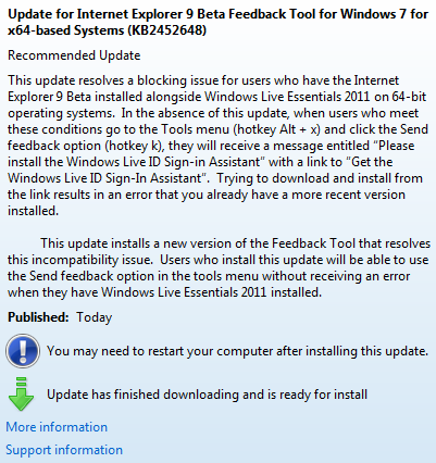 Come to find out, there were two updates, both of which for Microsoft’s IE 9 Beta. The first was an update to resolve a Feedback issue that users (including myself) have been having when running IE 9 Beta on a 64-bit Windows 7 and Windows Live Essentials 2011 (it must meet those criteria). Essentially, when trying to send feedback via the Tools menu in IE9, the pop-up that appeared would continuously notify users that they needed to update or install the Windows Live ID Sign-In assistant. Most users will find that they actually have this tool installed, but somewhere along the lines from IE9 to transmitting the data, there was a bug. That bug is now fixed with this update, KB2452648, fixes this issue and allows users to continue submitting feedback on IE9. After the update, users can easily log into Microsoft Connect using their Windows Live ID.