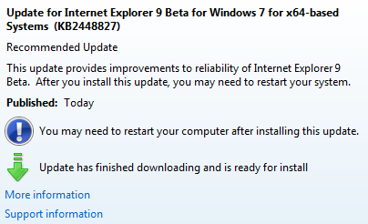 The other update, KB2448827, addresses reliability and performance issues that the IE 9 Beta has experienced. No beta is perfect, and I can definitely say I’ve had one or two issues with the IE 9 Beta (all of which are to be expected, of course). Only time will really tell whether or not this update improves the reliability and ultimately the usability of the IE 9 Beta. Here’s a brief statement on it via Microsoft’s Windows Update: