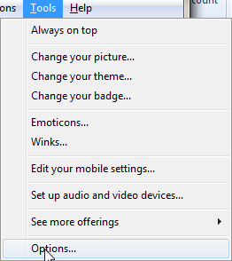 You’ll need to access the menu for Live Messenger in order to disable the Start-Up procedure. When you have Live Messenger as the active window simply tap the ALT key to access the menu. From there, select Tools –> Options.
