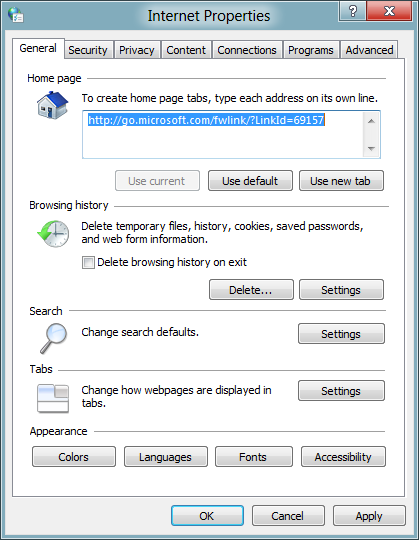 See the highlighted text? This will automatically point your browser to MSN.com (actually, it first directs to Microsoft.com, then forwards you to one of their MSN servers) … a potentially risky environment. Instead, I like to leave this option blank and instead navigate directly to the Microsoft Security Essentials download page. You could, of course, set IE’s home page to something like Google or another preferred search engine, but this also has had it’s issues with security in the past. To be safe, I opt to just leave it blank and navigate to the MSE download site manually.
